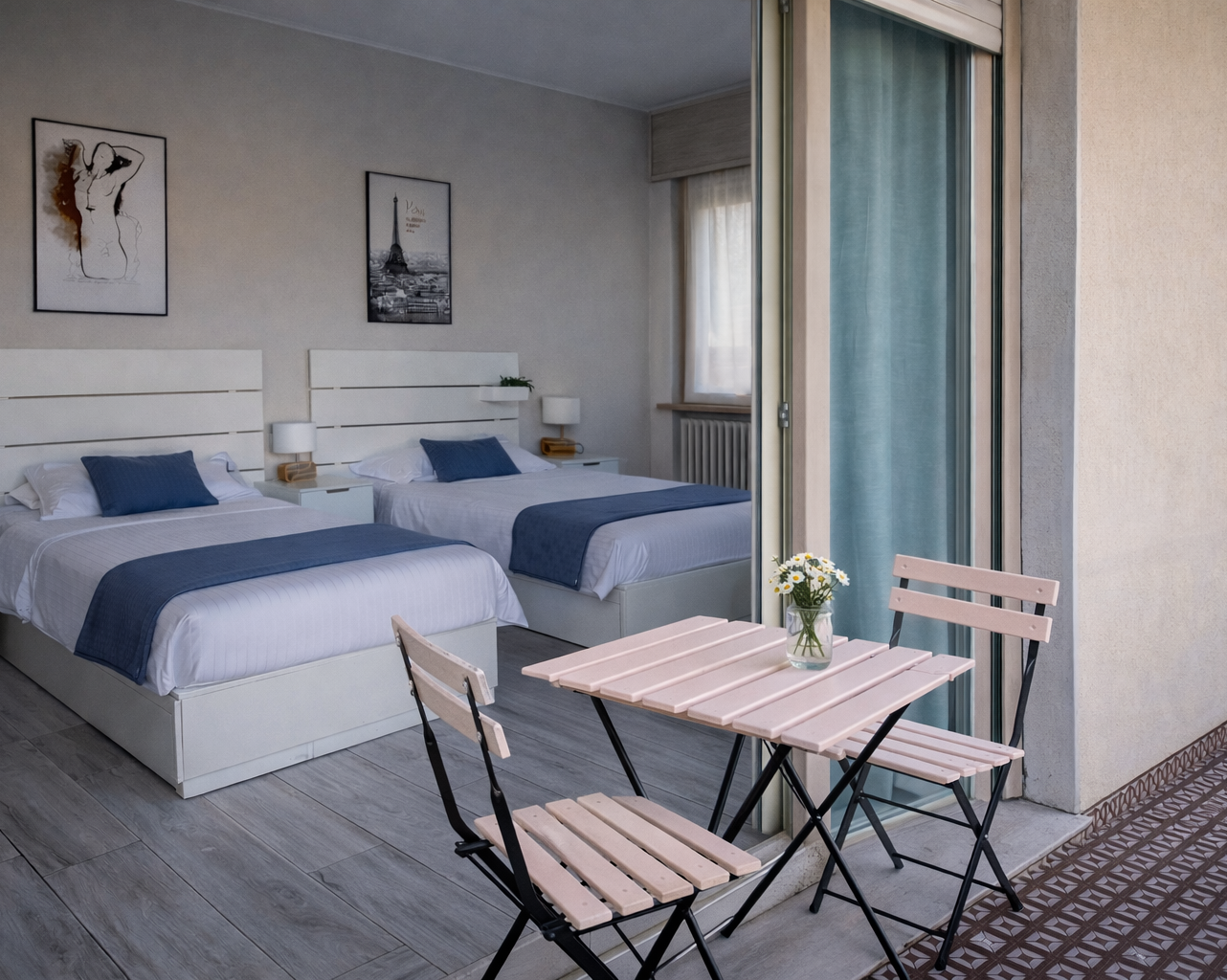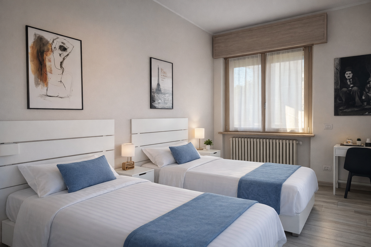 Bright and spacious twin room, ideal for friends or travelers looking for comfort and practicality. Furnished in a modern style with light tones and carefully selected details, it offers a welcoming and functional atmosphere.