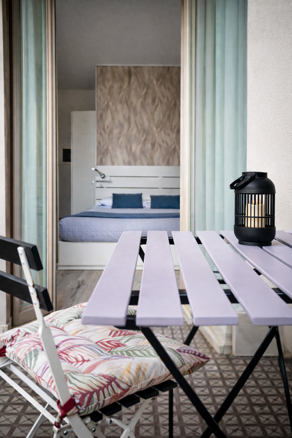 The room is bright and airy, thanks to a large glass door opening onto a private terrace with table and chairs, perfect for enjoying some outdoor relaxation. It includes a private bathroom with shower, air conditioning, free Wi-Fi, and a flat-screen TV, offering all essential amenities for travelers.